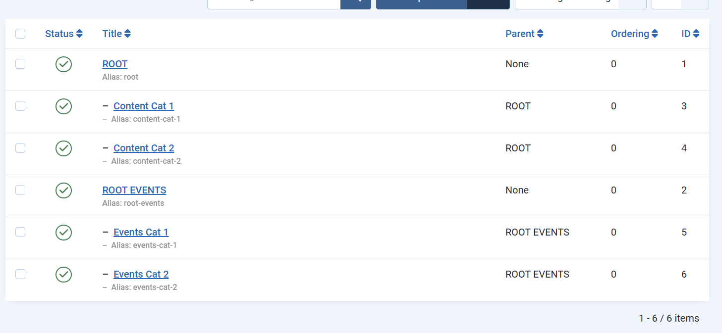 Administrators can quickly assess the category structure, including root-level categories and their children, as well as the publication status and ordering of each category. The hierarchical display makes it easy to understand how content is grouped and how categories relate to one another.